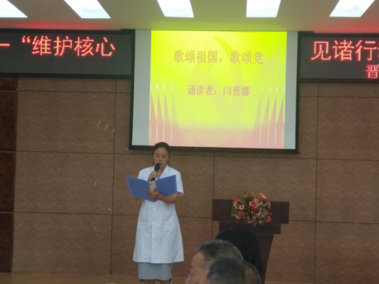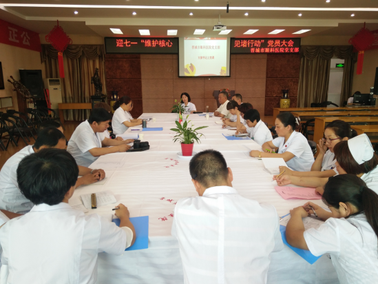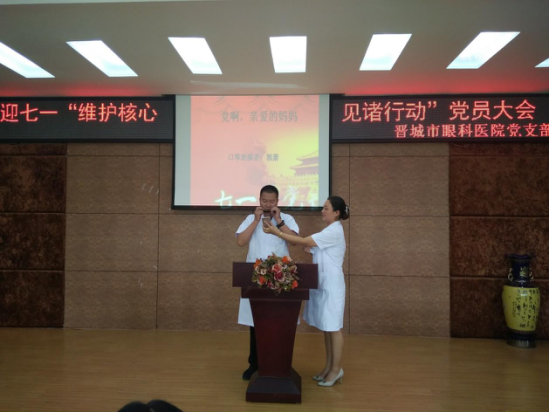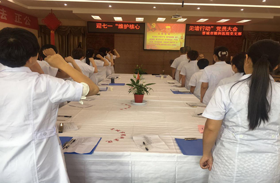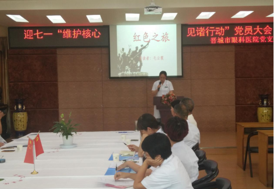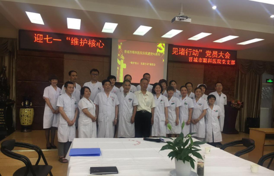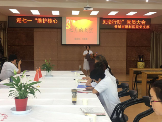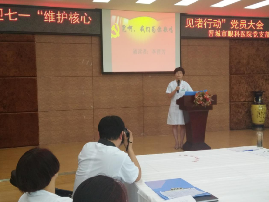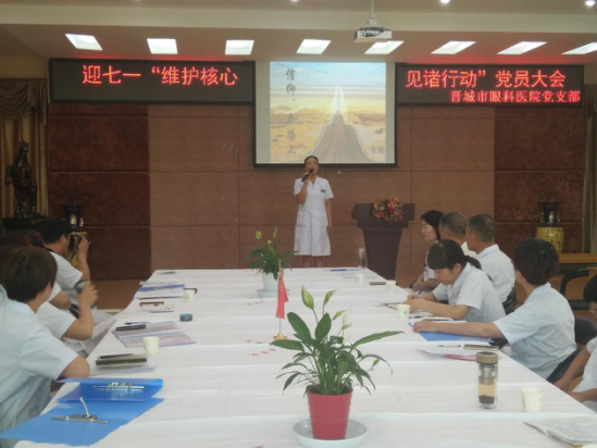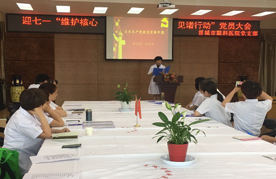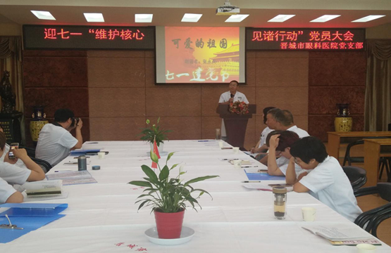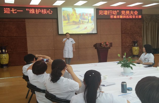 为纪念中国共产党成立96周年,深入推进“两学一做”学习教育常态化、制度化建设,充分发挥党组织战斗堡垒作用和共产党员先锋模范作用。2017年6月28日下午,晋城市眼科医院党支部组织全体党员召开迎七一“维护核心 见诸行动”党员大会。共开展三个方面内容:支部书记上党课、重温入党誓词、诗歌诵读和唱红歌。
