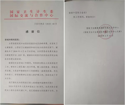 会上,国家卫健委国际交流与合作中心为我院颁发了感谢信,对我院在2018年作为健康快车基地医院,全力配合健康快车晋城站工作并圆满完成任务表达诚挚的谢意!下一步我院将积极申请成立健康快车白内障治疗中心,造福更多贫困白内障患者,真正为我市留下一列不走的健康快车。