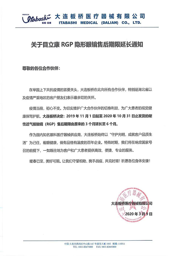 关于目立康RGP隐形眼镜售后期限延长的通知